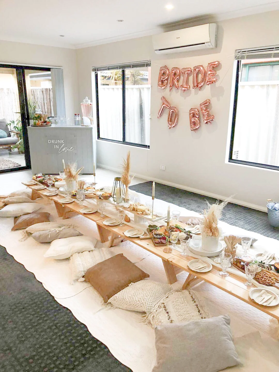 Low wooden picnic tables, picnic blankets/floor rugs & cushions around the tables